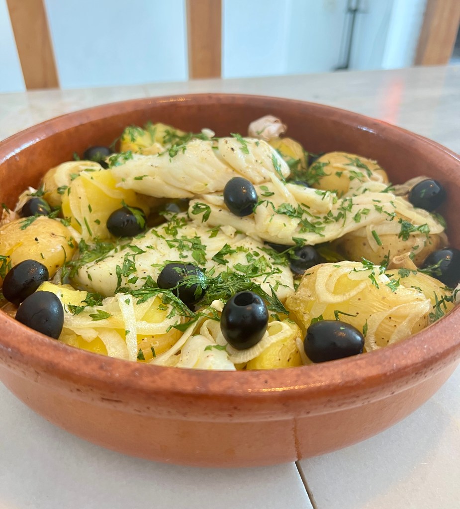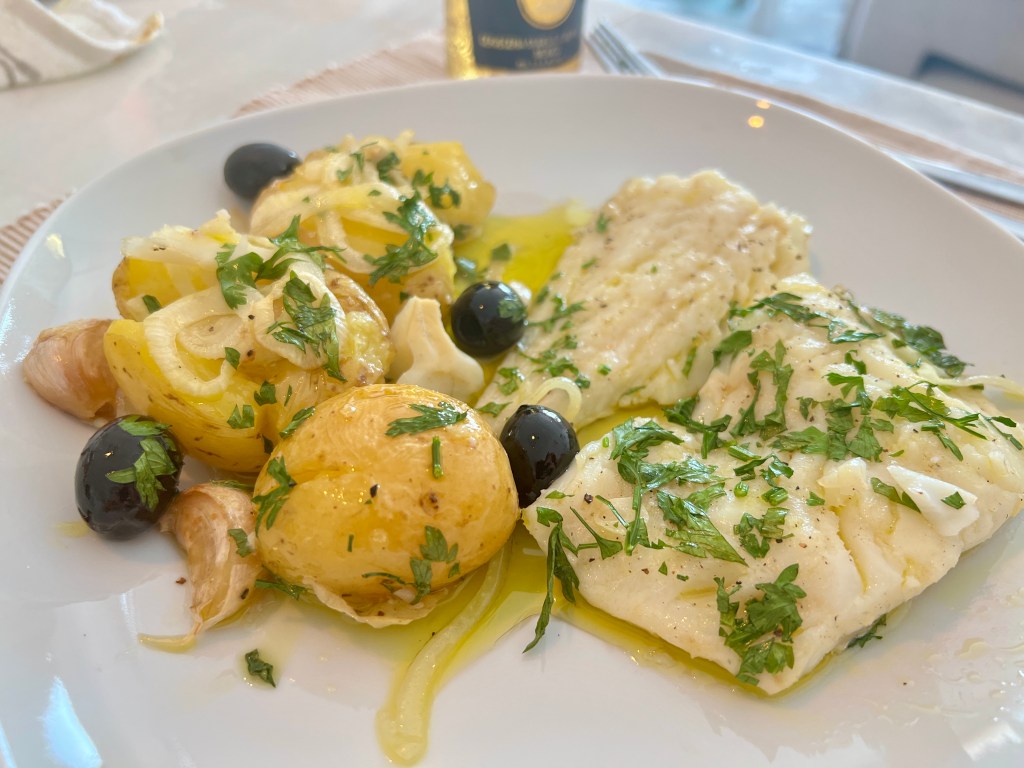 Bacalhau, or salted cod, is at the heart of Portuguese cuisine, and one of the most beloved ways to prepare it is Bacalhau à Lagareiro. This dish features tender oven-roasted cod, golden crushed potatoes (“batatas ao murro”), caramelized onions, and plenty of high-quality olive oil—a true celebration of Mediterranean flavors! 🇵🇹✨